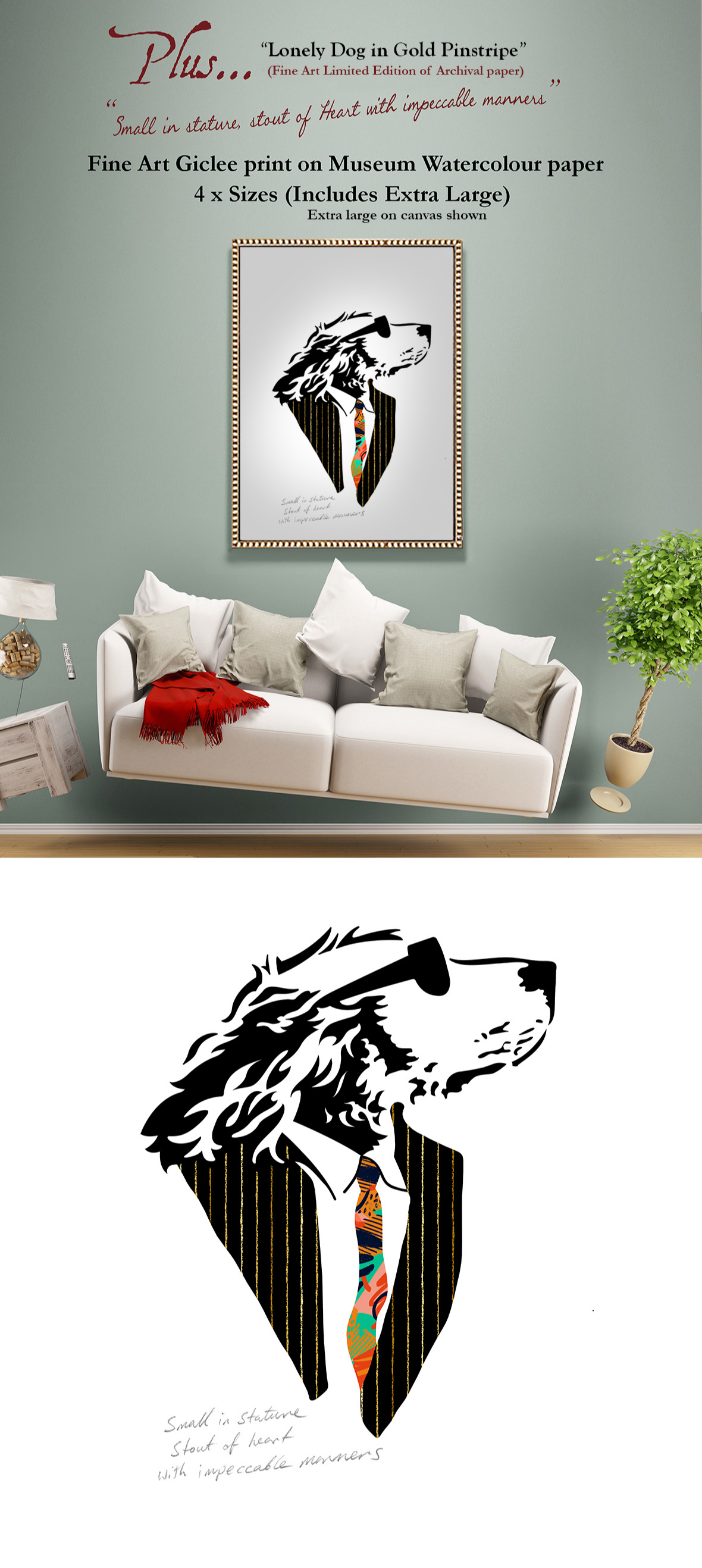 The original artwork “Lonely Dog in Red Tie” (similar to accompanying image “Lonely Dog in Gold Pin Stripe”) – does not exist (DOES NOT EXIST) in the physical world, as it was created digitally.