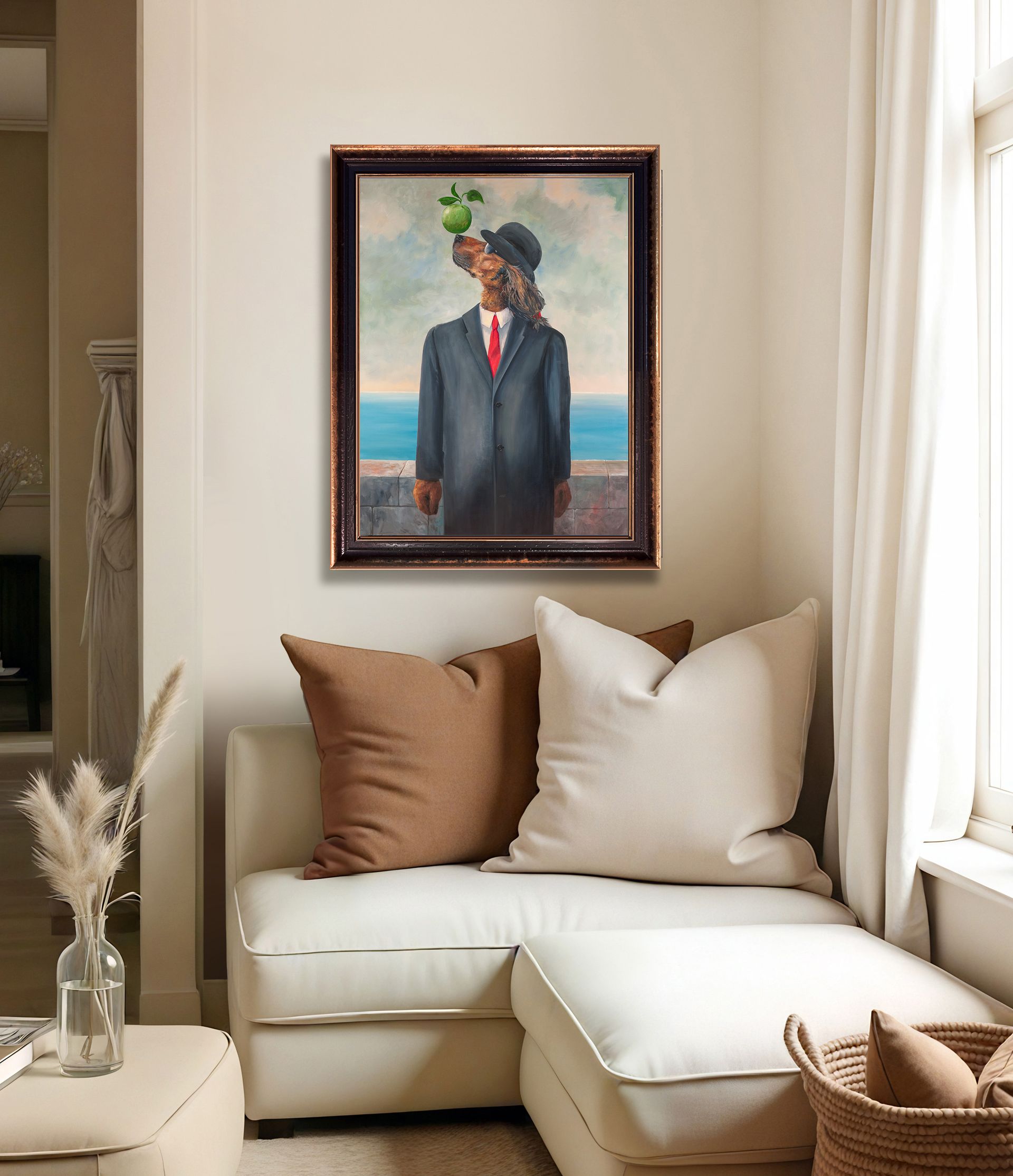 The hovering apple above Sir Edwin’s snout at first appears to sit on his snoz as ordinary apples do. But the Hound with red tie is no ordinary Hound, his destiny, nay calling, was to expose the faceless bowler-hat man as a charlatan.