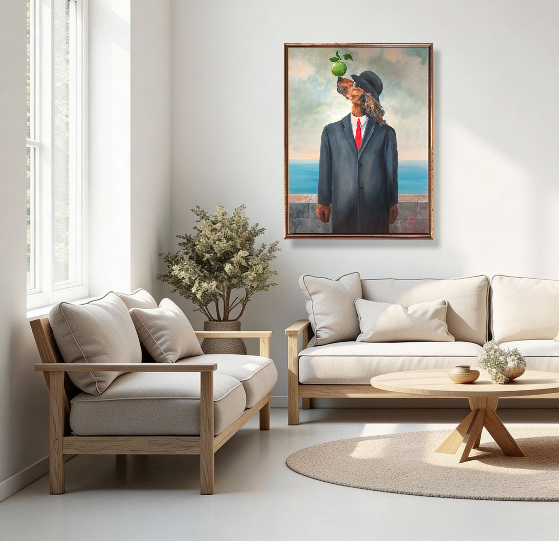 A dog with human features in a suit and bowler hat stands by the sea, balancing a green apple in front of its nose.